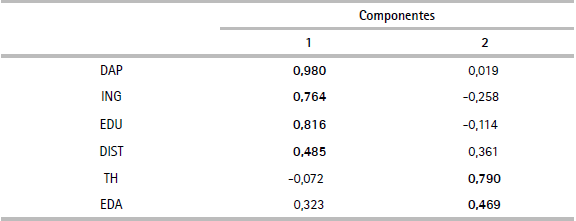Según el cuadro 19, los componentes según las variables serían: Primer componente (económico): DAP, ING, EDU, DIST. Segundo componente (social): TH, EDA.