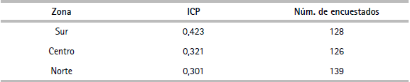 Finalmente, para agregar la información se utiliza el método de la media aritmética ponderada, el cual se calcula con la media aritmética con base en los valores ponderados y normalizados antes. Después de haber agregado la información se obtiene el ICP, clasificándolo según las zonas de ubicación geográfica de los encuestados. El índice se muestra en la escala de 0 a 1, tal como se ha explicado en la etapa de normalización.