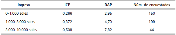 Según el cuadro 21, cuanto mayor es el ingreso de la persona mayor es el ICP; es decir, si las personas tienen un ingreso económico más alto, mayor será su capacidad de pago. En efecto, las personas que poseen un ingreso entre 0 y 1.000 soles tienen un ICP de 0,266, las personas que poseen un ingreso entre 1.000 y 3.000 soles tienen un ICP de 0,372 y las personas que poseen un ingreso entre 3.000 y 10.000 soles tienen un ICP de 0,508.