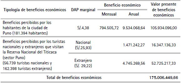 Si se hacen los mismos cálculos en el contexto del modelo referéndum, tomando en cuenta una DAP mensual de S/5,43 para los habitantes de la ciudad de Puno y la DAP de turistas nacionales y extranjeros ilustrados en el párrafo anterior, se obtiene un VPB de S/200.401.609,67, generando un VPN de aproximadamente S/34.192.480 y una RBC de S/1,2.