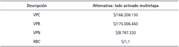 Por otro lado, de acuerdo con el proyecto MSTARP, el valor presente de costos (VPC) del proyecto (incluye costos de inversión y de operación y mantenimiento) a precios sociales para la alternativa: Lodo activado multietapa13, asciende a la suma de S/166.209.130,00. De acuerdo con el cuadro 23 se tiene un valor presente neto (VPN) de S/8.797.320 con una relación beneficio/costo (RBC) de S/1,1, lo que indica que por cada sol invertido se obtendrán beneficios adicionales de S/0,1 soles como retorno social, demostrándose, de esta manera, retornos positivos de la inversión.