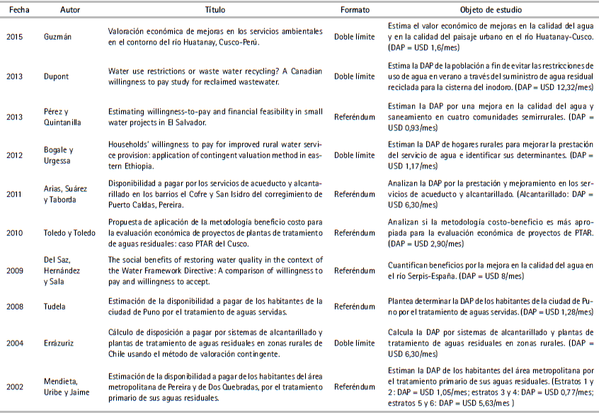 En la literatura nacional e internacional existe una gran variedad de estudios empíricos que utilizan el MVC en la estimación de la DAP por mejoras en los servicios de saneamiento básico (agua y alcantarillado). En el cuadro 1 se presenta un resumen de la revisión de literatura.