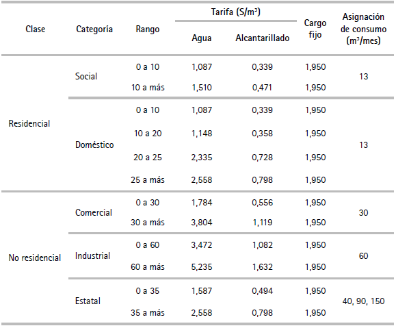 Se consideran las asignaciones de consumo para los usuarios no medidos, calculadas a partir del consumo promedio de los usuarios medidos de la misma categoría o clase de usuarios. Por otro lado, la estructura tarifaria vigente considera una política de subsidios cruzados, que implica la existencia de dos tipos de usuarios: los que reciben subsidio (reciben incrementos tarifarios menores o iguales a los incrementos sobre la tarifa media definida en la fórmula tarifaria) y los que otorgan subsidio (reciben incrementos tarifarios mayores a los incrementos sobre la tarifa media definida en la fórmula tarifaria) (SUNASS, 2011).