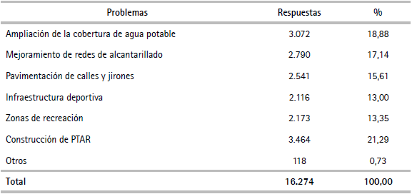 Según el cuadro 3, la construcción de una PTAR (21,29%) y las obras destinadas a la ampliación de cobertura de agua potable (18,88%) son las más importantes para el mejoramiento de la ciudad. Muy cerca se encuentran los referidos al mejoramiento de redes de alcantarillado (17,14%), pavimentación de calles y jirones (15,61%), zonas de recreación (13,35%) e infraestructura deportiva (13,00%).
