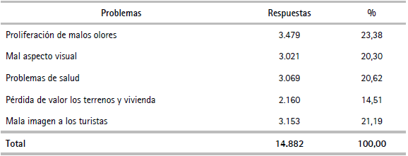 El principal problema derivado del colapso de la PTAR El Espinar es la proliferación de malos olores (23,38%) y la consecuente mala imagen frente a los turistas (21,19%); muy cerca también se encuentra el mal aspecto visual (20,30%) y los problemas de salud de las personas (20,62%). Por otro lado, cerca del 14,51% de la población manifiesta que también un efecto del colapso de la actual PTAR es la pérdida de valor de los terrenos y viviendas aledañas a la planta (cuadro 4).