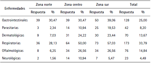 Respecto al padecimiento de enfermedades durante el último mes, en el cuadro 5 se puede apreciar que gran parte de los hogares entrevistados padeció de enfermedades respiratorias, seguido de enfermedades gastrointestinales. En este último caso, si se desagrega este resultado por zonas, se puede observar que en la zona sur (donde se encuentra localizada la PTAR) están los mayores casos de este tipo de enfermedades de origen hídrico, así como enfermedades dermatológicas.