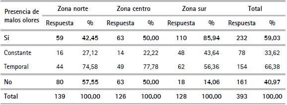 Respecto a la percepción de malos olores provenientes de la PTAR El Espinar, de acuerdo con el cuadro 6 se puede indicar que de un total de 393 encuestas el 59,03% refirió que existen malos olores provenientes de la planta; de este porcentaje, el 33,62% indica que la percepción de olores es constante mientras que el otro 66,38% refirió que es de carácter temporal. Al desagregar los resultados por zonas, se puede comprobar que efectivamente la zona sur de la ciudad es la que más se perjudica por el colapso de la actual PTAR; en efecto, de un total de 128 encuestas efectuadas en la zona sur de la ciudad, el 85,94% indicó que existen malos olores provenientes de la actual planta de tratamiento.