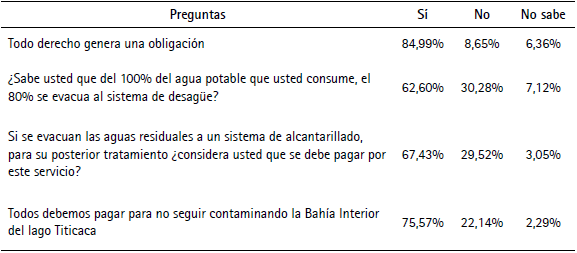 La preocupación por cuidar la BILT para las generaciones futuras puede verse en la gran mayoría de encuestados (75,57%). Por su parte, el 84,99% de los entrevistados tiene conocimiento pleno de sus obligaciones como ciudadano, el 67,43% considera que se debe pagar por el tratamiento de aguas residuales y el 62,60% manifiesta que tiene conocimiento de que gran parte del consumo de agua potable se evacua al sistema de desagüe (cuadro 7).