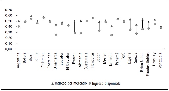 No solo esto, como veremos con más detalle en la siguiente sección, la política fiscal y la distribución también resultan ser asuntos clave dentro del desempeño económico de los países. De hecho, “muchos analistas sostienen que el fracaso en los objetivos de política fiscal es un factor esencial de por qué [América Latina] ha tenido un mal rendimiento en cuanto a crecimiento y equidad” (Cárdenas y Perry, 2011, p. 266). Entonces, tiene sentido pensar que la alta y persistente desigualdad de América Latina (al igual que la de Colombia) puede explicarse, al menos en alguna parte, debido a las políticas fiscales implementadas en los países de la región a lo largo del tiempo.