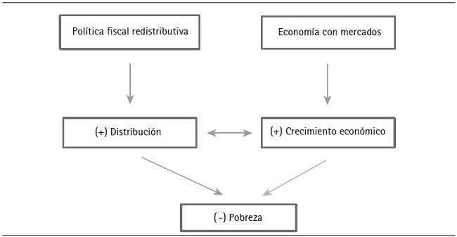 El trabajo está estructurado en cuatro secciones. En la primera parte, señalamos que una economía con mercados es fundamental para poder tener un crecimiento sostenido. En la segunda parte, argumentamos que la política fiscal es una herramienta indispensable para llevar a cabo una redistribución efectiva del ingreso. En la tercera parte, resaltamos la redistribución del ingreso como un factor esencial para que el crecimiento económico sea duradero y estable y que además tenga un mayor impacto en la reducción de la pobreza. Finalmente, defendemos que una mayor carga impositiva no va necesariamente en detrimento del crecimiento, sino que, por el contrario, lo puede favorecer. Este esquema se puede representar de la siguiente manera: