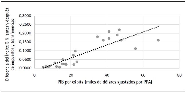 Paradójicamente, los países latinoamericanos, con niveles altos de pobreza y de desigualdad, y que, por lo tanto, deberían distribuir mediante la política fiscal con mucho más ahínco sus recursos, lo hacen menos. La figura 5 muestra lo que Lindert (2014, p. 15, citado por Lustig, 2015, p. 304) llama la paradoja de Robin Hood: los países más pobres y, que necesitan con más urgencia una redistribución del ingreso, redistribuyen menos5. En contraste, en los países ricos, la política fiscal (impuestos y transferencias) es capaz de reducir la desigualdad del ingreso en cerca de un tercio (Bastagli et al., 2015, p. 72). Como consecuencia, “cerca de dos terceras partes de la diferencia promedio de desigualdad en el ingreso disponible entre países desarrollados y Latinoamericanos es explicada por diferencias en el impacto redistributivo de los impuestos y las transferencias” (p. 60). En otras palabras, la desigualdad (y consecuentemente la pobreza) de América Latina sería mucho menor si sus países tuvieran una política fiscal mucho más efectiva.