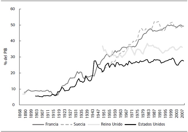 los ingresos por impuestos, como proporción del PIB, se han incrementado de manera significativa en todos los países desarrollados en el último siglo, pero el nivel de crecimiento ha permanecido relativamente estable. Esto sugiere la inmediata conclusión que, en la práctica, la mayor carga impositiva global no afecta la tasa de crecimiento. (p. 157)