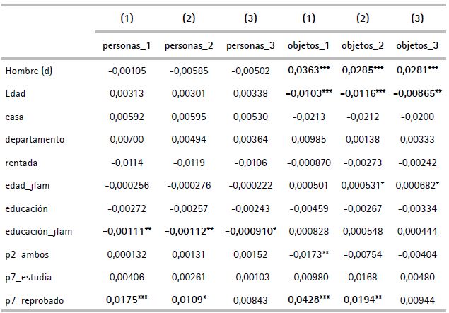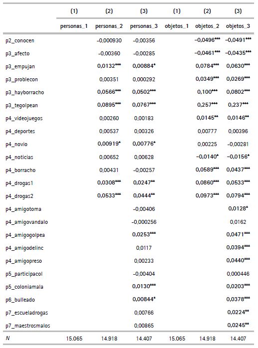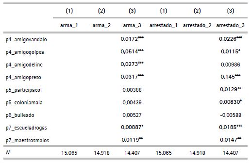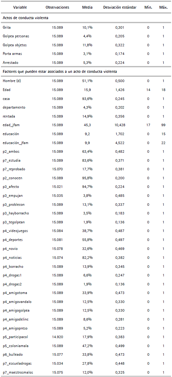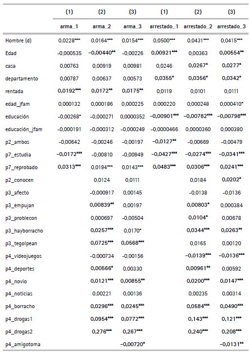 Para la variable “golpear personas” se obtuvo la información de la pregunta 3.4.7, en la que le preguntan al joven si en su familia generalmente le pega a la persona con la que discute, y de las preguntas 5.23.4 y 5.23.5, en la que le preguntan si ante un problema con sus vecinos los empuja o intimida, o los golpea. En caso de haber respondido que sí en por lo menos uno de estos tres casos, la variable “golpea personas” toma el valor de 1. La variable “por tar armas” se construyó con información de la pregunta 4.6.8 (si alguna vez ha tenido un arma para defenderse o para que lo respeten los demás), y de la pregunta 5.23.6 (ante un problema con los vecinos, les saca un arma para que les quede claro que no se deben de meter con él o ella), si la respuesta fue sí en por lo menos una de estas dos preguntas, la variable “porta armas” toma el valor de 1. Se menciona que un arma puede ser cuchillo, navaja, pis tola, entre otras.