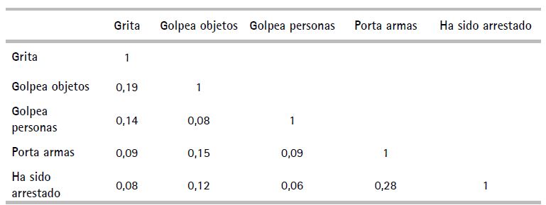 Para demostrar que las variables utilizadas como proxy de conductas violen tas son diferentes entre sí, se obtuvieron las correlaciones simples entre estas variables. Se observa que todas las correlaciones entre las diferentes variables son muy bajas, los valores más altos observados entre estas variables son 0,28, que se da entre “porta armas” y “ha sido arrestado”, y 0,19 que es la correla ción entre “grita” y “golpea objetos” (cuadro 1).