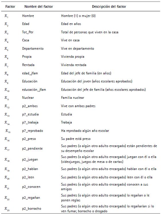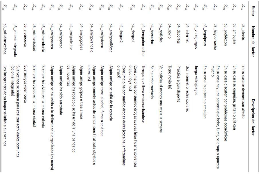 El factor X25 (p3_empujan) está construido con información de las preguntas 3.1.7, 3.1.9 y 3.1.1, en las que cuestionan al joven si en su hogar se critican constantemente, se gritan e insultan cuando discuten, se empujan, pellizcan o jalonean. Si en al menos uno de estos casos la respuesta es sí, este factor toma el valor de 1. Para el factor X28 (p3_te golpean) se usó información de las preguntas 3.5.9 y 3.5.10, en las que le cuestionan al joven si su papá, mamá, tutor o adulto encargado lo empujan, pellizcan o jalonean bruscamente; lo gol pean o le lanzan objetos; si en cualquiera de las dos situaciones la respuesta es positiva, al factor X28 se le asigna el valor de 1. El factor X30 se construyó con información de las preguntas 4.1.3 (se entretiene con redes sociales como Facebook, Twitter, etc.) y 4.1.4 (se mete a Internet). En el factor X36 (p4_dro gas1) se utilizó la información de las preguntas 4.6.4 (alguna vez en su vida ha consumido marihuana), 4.6.5 (alguna vez en su vida ha inhalado solventes) y 4.6.6 (alguna vez en su vida ha consumido algún tipo de alucinógeno), si respondió que sí a por lo menos una de las tres preguntas anteriores, el fac tor X36 toma el valor de 1.