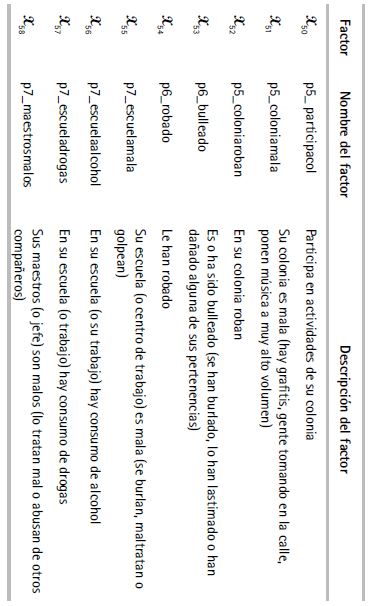 Los factores X51 y X52 se construyeron con información de la pregunta 5.19, si respondieron que muy frecuente o frecuente han visto en su colonia o barrio los siguientes casos: para el factor X51 (su colonia es mala), 5.19.1 (hacen ruido: música a alto volumen, fiestas, reparando o realizando alguna actividad domés tica); 5.19.2 (grafitean paredes o rayan autos) y 5.19.5 (toman alcohol en la calle); y para el factor X52 (en su colonia roban), 5.19.3 (rompen ventanas de casas, negocios o autos); 5.19.13 (asaltan o roban casas, negocios o vehículos); 5.19.14 (asaltan o roban a personas en la calle); y 5.19.15 (amenazan o extor sionan). Si alguna de las situaciones anteriores fue respondida como que pasa muy frecuente o frecuente, se asignó al factor correspondiente el valor de 1.