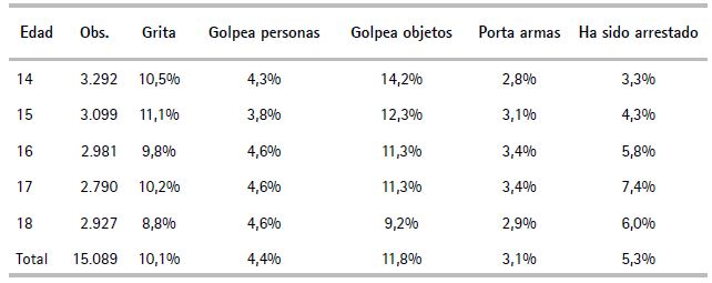 En el cuadro 4 se muestra el porcentaje de jóvenes que cometen algún acto de conducta violenta por tipo y por edad. Como puede observarse, con la edad aumenta el porcentaje de jóvenes que portan armas y el porcentaje de jóvenes que han sido detenidos o arrestados; mientras que el porcentaje de jóvenes que golpean objetos disminuye con la edad.