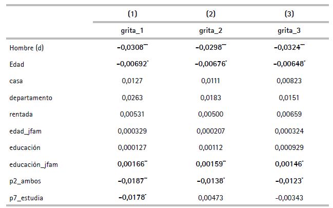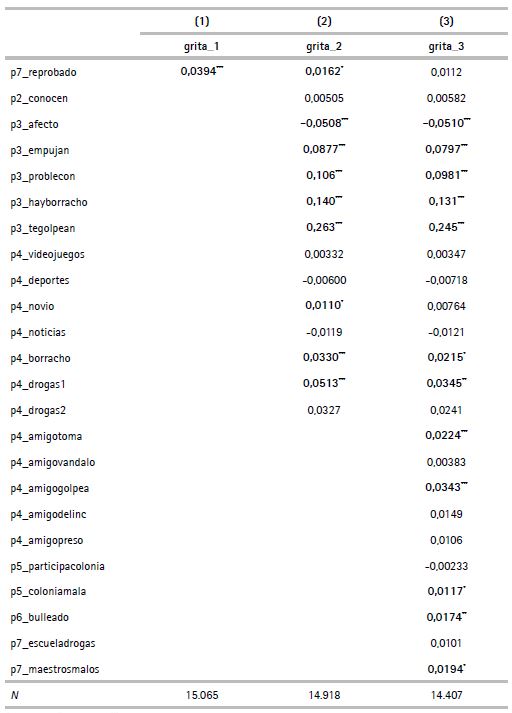 Siguiendo los resultados del cuadro 5, para el primer grupo de factores (carac terísticas del joven y su familia), se observa que en las tres especificaciones que aparecen en el cuadro, los hombres, comparados con las mujeres, tien den a efectuar menos el acto violento de gritar, ya sea en su casa o fuera de ella. También, mientras más edad tiene el joven o el que ambos padres vivan con el joven, está asociado a que este acto violento se realice menos. Como mencionamos, la aparente correlación positiva entre haber reprobado y gritar desaparece una vez que entran todos los factores en consideración.