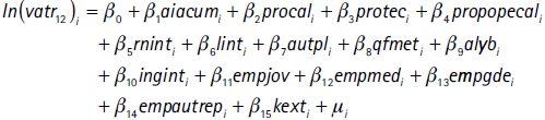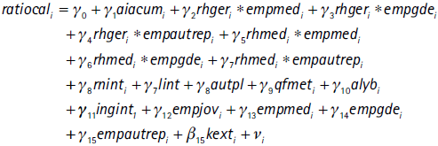 (A7)Las variables explicativas representan: aiacum (AI acumuladas por empresa); propcal, proptec y propopecal (proporción de empleos profesionales, técnicos y de operarios calificados); rnint , lint, autpl, qfmet , alyb, ingint (variables fic ticias de grupos industriales RN-intensivo, L-intensivo, automotor-plásticos, químico-farmacéutico-metalúrgico básico, alimentos y bebidas, ING-intensivo); empjov (empresa joven); empmed, empgde, empautrep (empresa mediana, grande y auto-representada); kext (empresa con participación de capital extranjero). En la ecuación de ratios se incorpora rhger y rhmed (empresas con área de recursos humanos en posición de gerencia o en sector medio), que se interaccionan con el tamaño de la empresa.