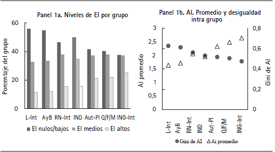 En términos generales, el 50% de las empresas tiene niveles nulos o bajos de EI, el 35% tiene niveles medios y solo el 15% alcanza niveles altos, es decir, realiza al menos 5 actividades de innovación diferentes. De los 6 grupos ana lizados, 3 de ellos superan en desempeño la distribución de EI promedio de la industria (IND). Se trata de los grupos ingeniería-intensivo, química-farmacéu tica-metálica básica y automotor-plásticos. Los grupos intensivos en trabajo, en recursos naturales, y el productor de alimentos y bebidas se ubican en nive les de EI por debajo del promedio industrial. A partir del gráfico se puede ver que aquellos grupos con mayor (menor) participación de empresas con nive les de EI alto tienen a su vez menor (mayor) participación de empresas con EI bajo o nulo. Esta tendencia se identifica más claramente en el panel 1b, que muestra para cada grupo el nivel de actividad de innovación (AI) promedio por empresa y una medida de desigualdad de las AI hacia dentro de cada grupo, con base en el coeficiente de Gini. En aquellos grupos con mayores niveles de AI promedio se registra una mayor homogeneidad en las AI acumuladas hacia dentro del grupo (un menor coeficiente de Gini). En otros términos, a nivel de grupo industrial, mayores esfuerzos de innovación se asocian a una menor heterogeneidad de esfuerzos intra grupo.