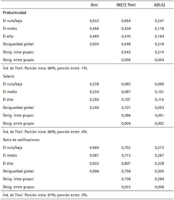 Si analizamos la porción de desigualdad entre e intra grupos (que puede esti marse con base en el índice de Theil), podemos ver que la porción intra capta más del 95% de la desigualdad, y esto se da para las tres variables analizadas. Si bien la evidencia empírica sobre descomposición muestra que la desigualdad entre grupos resulta menor a la desigualdad dentro de ellos (con una relación habitual en torno al 25% y 75%, respectivamente) bajo este agrupamiento la porción entre grupos resulta significativamente menor a dicho registro. Este fenómeno puede ser un indicio de que la variable EI no explica tanto la des igualdad entre grupos para las dimensiones laborales y productivas analizadas como es el caso de otras variables de agrupamiento, lo cual promueve a inda gar acerca de los resultados de una descomposición por grupos industriales.