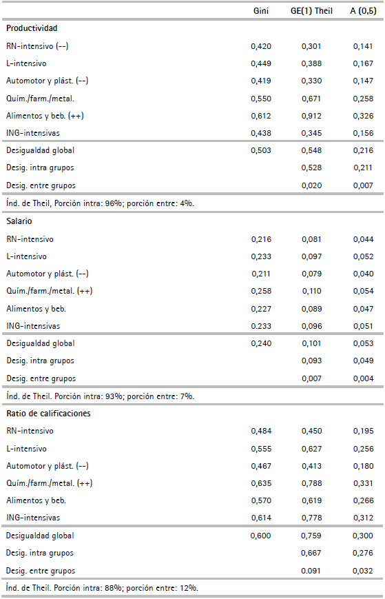 Para identificar los atributos principales (salarios, productividad y calificacio nes relativas) se estimaron valores promedio relativos al promedio industrial, los que se pueden complementar con las medidas de desigualdad estimadas para cada grupo (véase en el cuadro 4)18.