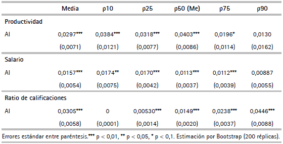 A partir de estos resultados, se puede inferir que los EI están correlacionados significativamente con la productividad, el salario y las calificaciones relativas. Si bien las tres estimaciones de la media condicional resultan significativas, la profunda asimetría natural en las variables respuesta obliga a considerar la mediana como valor central de referencia. A partir de esta medida, se estima que aquellas empresas que realizan una AI adicional reportan un 4% de mayor productividad y un 1% de mayores salarios14. Para poder identificar si estas dis paridades entre el grado de correlación de AI con cada una de estas variables son estadísticamente significativas, se aplicó un test de diferencias entre los coeficientes de ambas ecuaciones15. A partir de este, se infiere que el grado de asociación de las AI adicionales con los niveles de productividad resulta más fuerte que aquel sobre salarios. Por otro lado, para el ratio de empleos más calificados (respecto a los menos calificados), las estimaciones dan cuenta de que una AI reporta 1,5 puntos porcentuales adicionales en el ratio de cali ficaciones de las empresas.