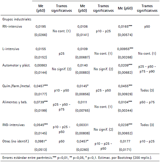 Partiendo del análisis de impactos de mayores EI para la industria en su con junto, en el siguiente cuadro se muestran los coeficientes de regresión de las actividades de innovación estimados sobre la media y cuantiles de la distri bución de las variables de interés13: