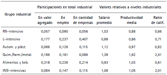 En este apartado se realiza una caracterización de los grupos industriales definidos, la cual complementa la interpretación de los resultados del análisis empírico. El cuadro 7 muestra indicadores de los grupos industriales para el año 2012, que sirven de puntapié para el análisis: