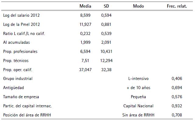 Asimismo, los grupos omitidos en la regresión sobre variables ficticias son: grupo industrial (otras industrias); antigüedad de la empresa (10 años o menos); tamaño de empresa (pequeña), participación del capital internacio nal (solo capital nacional) posición en área de recursos humanos (sin área de recursos humanos).