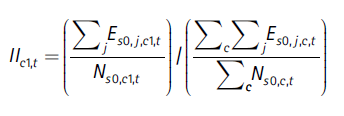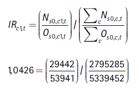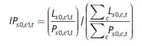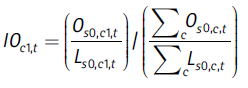 Para entender este índice, es importante observar que numerador y denominador solo difieren en que el primer paréntesis redondo en el numerador se refiere a la ciudad c1, mientras que el correspondiente paréntesis del denominador se refiere al agregado de todas las ciudades. La relación entre estos dos paréntesis capta, por consiguiente, el tamaño relativo de cada sector j en la ciudad. Los segundos paréntesis redondos actúan como ponderadores, y son iguales en el numerador y el denominador. Las ponderaciones son las participaciones de las mujeres en el empleo de los sectores en la ciudad c1.