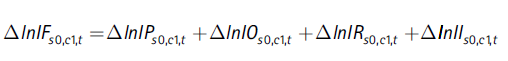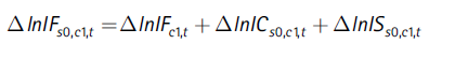El coeficiente de la izquierda de la Ecuación (19) es el índice que queremos descomponer, IFs0,c1,t (el mismo de la Ecuación (6) que presenta la descomposición según estructura del mercado laboral). Cada uno de los tres paréntesis a la derecha equivale ahora a un índice de la descomposición según la estructura productiva, así: