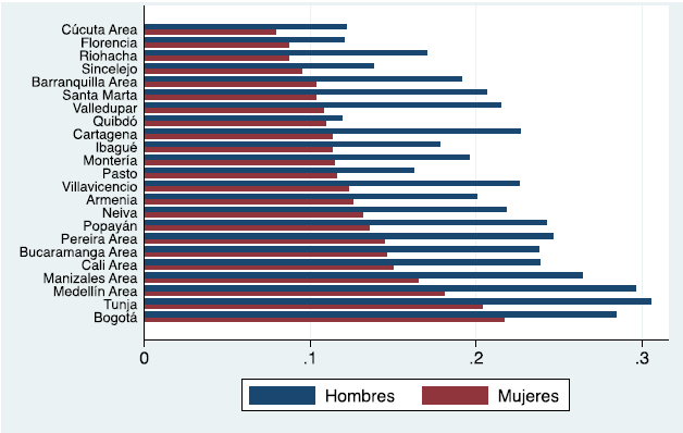Los principales resultados de esta primera metodología de descomposición pueden presentarse ahora para todas las ciudades con las ecuaciones (1), (5) y (11) para el promedio de todos los años entre 2008 y 2016, y la Ecuación (12) para los cambios entre 2008 y 2016. La tasa de empleo pleno y trabajo decente (Ecuación 1) masculina y femenina por ciudades (promedios 2008-2016) se presenta en el Figura 1. Las ciudades han sido ordenadas según su tasa de empleo pleno y trabajo decente de las mujeres. En todas las ciudades, es mayor la tasa masculina que la femenina. Las primeras van desde el 12 % (Florencia) hasta el 30,6 % (Tunja), las segundas fluctúan entre el 7,9 % (Cúcuta) y el 21,7 % (Bogotá). Esto implica distancias enormes respecto del objetivo de empleo productivo pleno y decente para todos, especialmente en el caso de las mujeres.