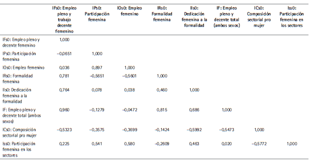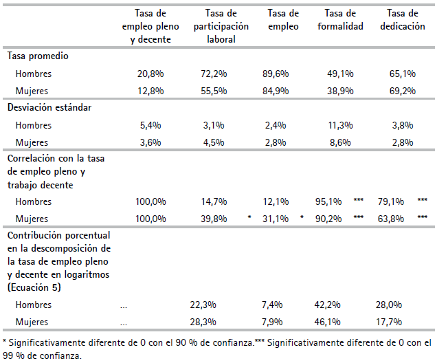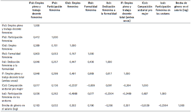 Por consiguiente, nuevamente la tasa de formalidad del empleo femenino se destaca como la variable de mayor influencia en la generación de empleo pleno y trabajo decente para las mujeres (véanse las correlaciones en el Cuadro A.4 del Anexo).