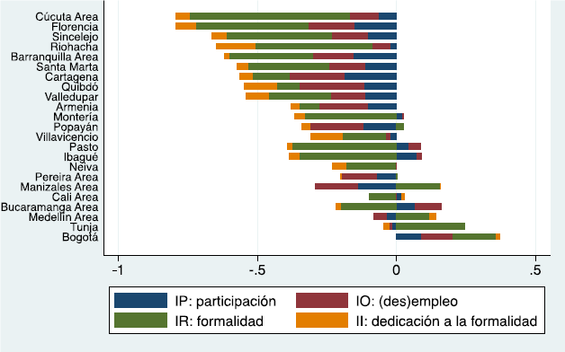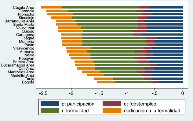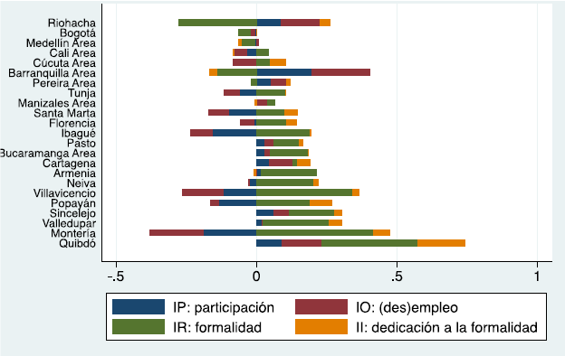 Como puede observarse, las tasas de formalidad (verdes) y las de dedicación (naranjas) están fuertemente relacionadas con el tamaño total de las barras, que representan la tasa de ocupación formal. Las tasas de participación (azules), aunque son relativamente grandes, no guardan una relación tan estrecha con el tamaño de las barras, mientras que las tasas de (des)empleo (rojas) son pequeñas y casi no varían.