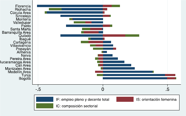 Los resultados de aplicar la Ecuación (9), que descompone el índice de empleo pleno y trabajo decente por ciudades para las mujeres, se presenta en el Figura 3. Recuérdese que los índices se interpretan como distancias respecto del promedio nacional (en logaritmos). Así, Cúcuta y Florencia son las ciudades con las menores tasas de empleo pleno y trabajo decente femenino con respecto al conjunto de las 23 ciudades (en promedio para el periodo de 2008 a 2016), y ello se debe, principalmente, a que sus tasas de formalidad son muy inferiores a las del conjunto de las 23 ciudades. Los demás componentes —participación, (des)empleo y dedicación— son todos negativos para estas dos ciudades. En contraste, Bogotá es la ciudad con la mayor tasa de empleo pleno y trabajo decente femenino. Con respecto al conjunto de las 23 ciudades, todos los componentes —participación, (des)empleo, formalidad, dedicación— son positivos.
