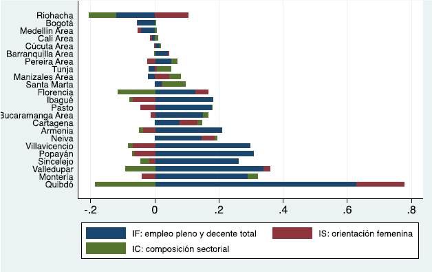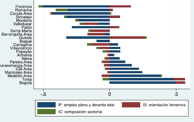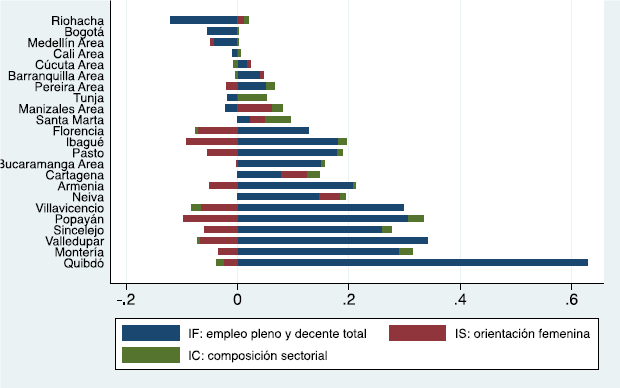 Es importante recordar que la descomposición es tautológica, en el sentido de que para cada ciudad el producto de los tres índices componentes es idéntico al índice de empleo pleno y trabajo decente femenino. Esto no depende de ningún supuesto sobre el comportamiento del mercado laboral ni de los sectores productivos.