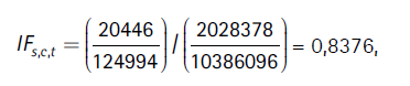donde el primer componente al lado derecho de la ecuación es el índice de empleo pleno y trabajo decente total, es decir, de ambos sexos, para la ciudad c1 en el año t, IFc1,t, que se define en forma análoga al índice de la Ecuación (2), pero agregando ambos sexos (en el numerador para la ciudad c1 y en el denominador para todas las ciudades):