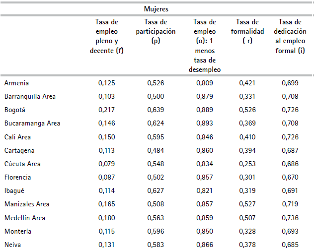 donde fs0,c1,t es la tasa de empleo pleno y trabajo decente, ps0,c1,t es la tasa de participación (según la definición usual del DANE), os0,c1,t es la tasa de empleo, es decir, 1 menos la tasa de desempleo según la definición usual del DANE, rs0,c1,t es la tasa de formalidad (según nuestra definición de empleo formal), e is0,c1,t es la tasa de dedicación al empleo formal de quienes son formales en algún momento del año, es decir, qué proporción del año contribuyó a la seguridad social a través de sus empleadores7. En el ejemplo de Armenia en 2016 para las mujeres, se tiene que: