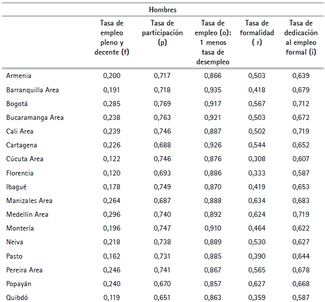 A partir de una definición estadística de empleo pleno y trabajo decente, en este trabajo se presentan dos métodos de descomposición por sexo de la tasa de empleo pleno y trabajo decente en las ciudades colombianas. Los dos métodos tienen por objeto medir cuánto influyen, por un lado, factores que reflejan la estructura del mercado laboral de las ciudades y, por otro, factores que reflejan la estructura productiva de las ciudades. Se utiliza información del Departamento Administrativo Nacional de Estadística (DANE) basada en la Gran Encuesta Integrada de Hogares (GEIH) e información de la Planilla Integrada de Liquidación de Aportes (PILA) del Ministerio de Salud y Protección Social (MinSalud) para el periodo de 2008 a 2016.