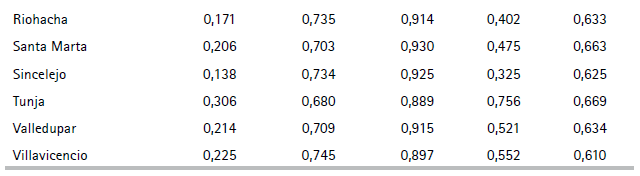 Cuadro A3. Matriz de correlaciones de los índices (en logs) (los índices son promedios de 2008 a 2016 por ciudad, n = 23 ciudades)