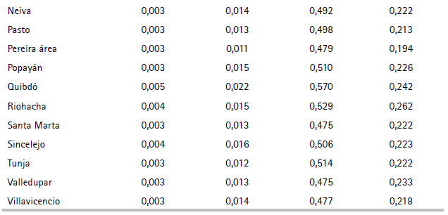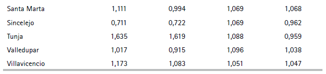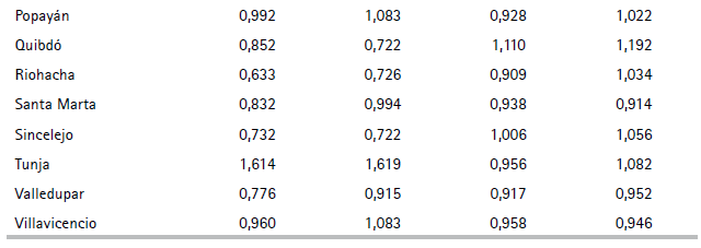 Valores positivos de cualquier elemento de esta expresión implican que la ciudad supera el patrón nacional, y viceversa. En el ejemplo de Armenia, los tres elementos están por debajo de patrón nacional. Si se toman diferencias en el tiempo se obtiene: