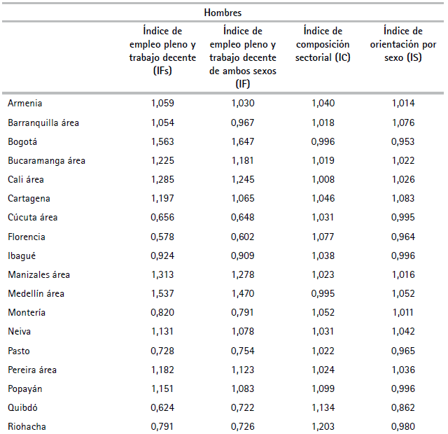 En cualquier caso, al agregar más los sectores, el factor preponderante para el empleo femenino pleno y decente sigue siendo la capacidad de la ciudad para generar empleo pleno y trabajo decente total, y no que el empleo en cada sector o la composición de los sectores sea o no favorable a las mujeres. Nótese, sin embargo, que los índices son agregados de sectores y, por tanto, no captan las diferencias que puede haber en sectores específicos entre unas ciudades y otras. Por ejemplo, el sector de comercio de ropa puede ser predominantemente femenino en Medellín, pero predominantemente masculino en Cali. Si otros sectores tienen los sesgos opuestos por sexo en Medellín y Cali, el índice IS total para ambas ciudades puede ser el mismo. Para captar la importancia potencial de estas diferencias, en el Cuadro A5 del Anexo se presentan los promedios y las desviaciones estándar de las variables wj ,c,t (Ecuación 16) y zs 0, j ,c ,t (Ecuación 17) por ciudad.