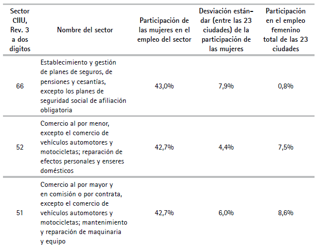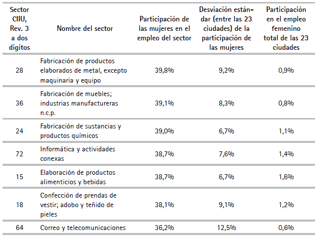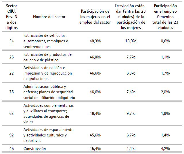 También puede ser ilustrativo saber en cuáles sectores las mujeres tienen las más altas participaciones y en cuáles menos. Para el efecto, en el Cuadro A6 del Anexo aparece la participación femenina por sector CIIU. Rev 3 a dos dígitos. En ningún sector hay mayoría de mujeres a nivel nacional, pero sí en algunas ciudades en muchos sectores, pues las desviaciones estándar de la participación femenina son suficientemente altas. Los sectores donde hay mayor proporción de mujeres son fabricación de automóviles, fabricación de productos de caucho y plástico, actividades editoriales y administración pública. Es interesante notar que algunos sectores que suelen asociarse con el empleo femenino no están en los primeros lugares de esta lista. El caso más notorio es el de confección de prendas de vestir, que aparece en el penúltimo lugar. Para entender por qué esto puede ser así, recuérdese que esta metodología descompone el empleo formal, no la totalidad del empleo. La confección de prendas puede ocupar a muchas mujeres, pero si ello ocurre en empleos independientes o a través de arreglos contractuales como el pago por unidad, que no se ciñen a la legislación laboral de salario mínimo y seguridad social, no aparacerán como empleo pleno y trabajo decente para los fines de esta descomposición. Debe, además, recordarse que las estadísticas se refieren al empleo del sector, que incluye muchas ocupaciones (administradores, vendedores, etc.), en adición a la de confeccionista.