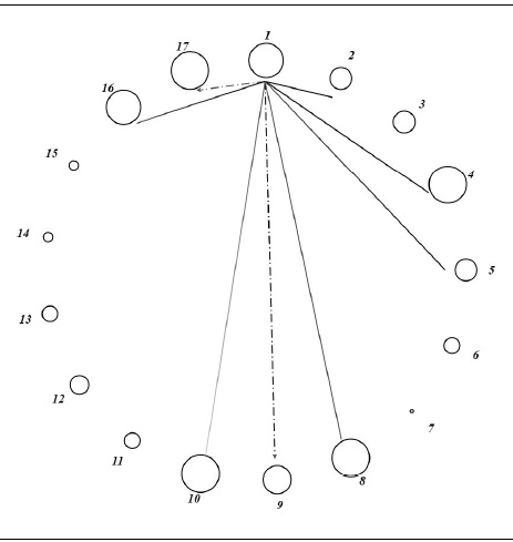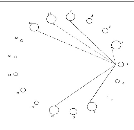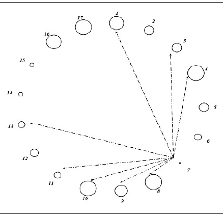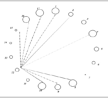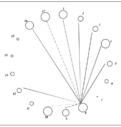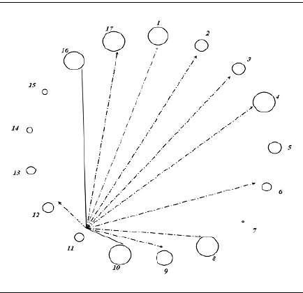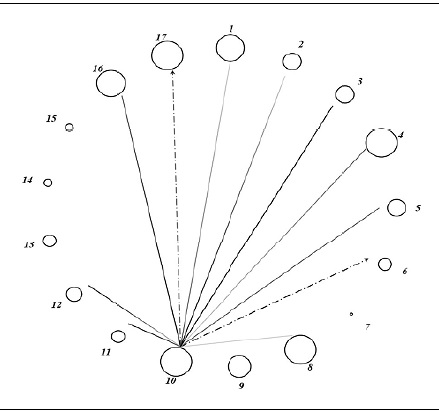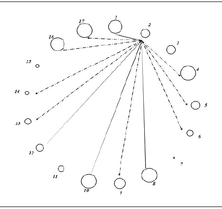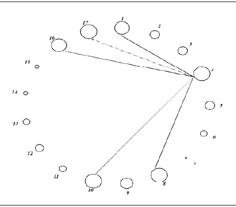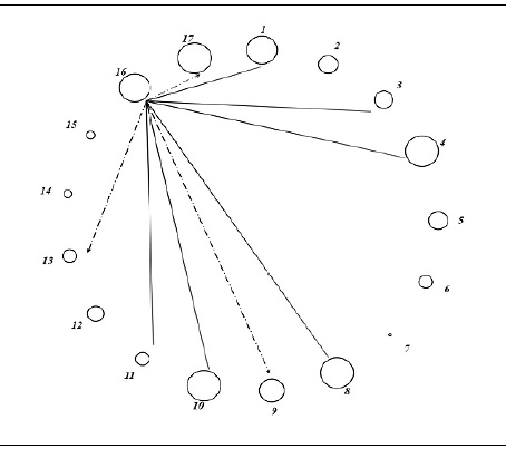 El tamaño de los círculos de la Figura 5 es proporcional a la cantidad de ODS principales cuyos programas incorporaron asuntos relevantes de los ODS colaterales. Así, por ejemplo, los círculos más grandes corresponden a los ODS 4, 8 y 10 que, como ODS colaterales, fueron incorporados por diez ODS principales. Por su parte, el círculo del ODS 7 es el más pequeño de la red, debido a que ningún ODS principal incluyó sus asuntos relevantes. El ODS 7, entonces, fue el único de los once ODS principales que no fungió al mismo tiempo como ODS colateral.