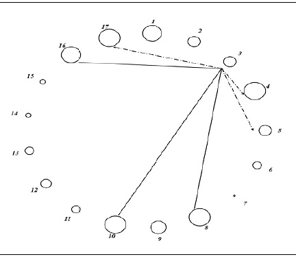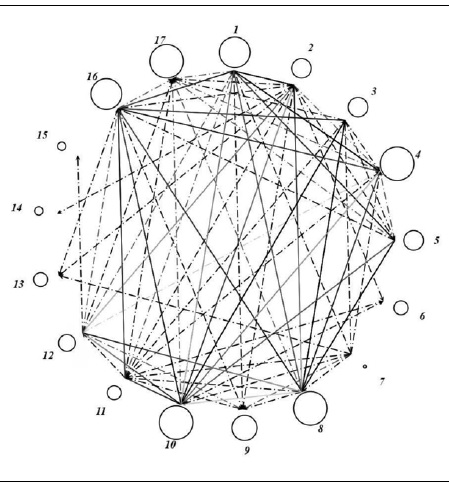 En general, de las 95 interacciones significativas existentes entre los ODS (Figura 5), 47 son unidireccionales (o líneas discontinuas terminadas con flechas) y 48 son bidireccionales, lo que se visualiza como 24 líneas continuas sin flechas que se superponen por pares. Por definición, los ODS que no son principales solo pueden incorporarlos programas de ODS principales y exhibir, por tanto, relaciones unidireccionales. Tal como lo muestra la Figura 5, ese es el caso de los ODS 6, 13, 14, 15 y 17.