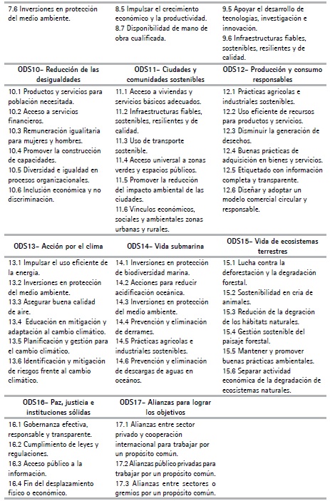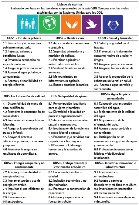 El presente análisis hace una propuesta novedosa al trabajar sobre asuntos relevantes y no sobre las metas de los ODS, debido a que: 1) los estudios de caso en los que se basa no relacionan los aportes de estos, ni al total de ODS ni a las metas en forma discriminada; y 2) el número de metas por ODS no es estándar, por tanto, no permite la comparación y no siempre se ajusta a las condiciones de los programas de responsabilidad social desarrolladas por el sector privado. A fin de evitar el margen de error se optó por adaptar las metas con base en instrumentos específicos para el sector privado que han sido desarrolladas por organizaciones internacionales (GRI y GSSB).