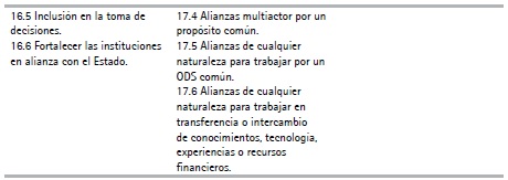 Finalmente, en sexto lugar, resulta importante dar una mirada al ODS 17. Parece obvio que este ODS no constituya el foco principal de ninguno de los programas de responsabilidad social, pues sus asuntos se enfocan en la forma cómo pueden organizarse los distintos actores para lograr objetivos. Al respecto, se destaca la ruptura frente a las acostumbradas maneras de proceder basadas en la acción individual que, de acuerdo con lo que muestran los casos incluidos en el análisis, promueve activamente las alianzas entre el sector privado y el público, con la participación determinante de la sociedad civil.