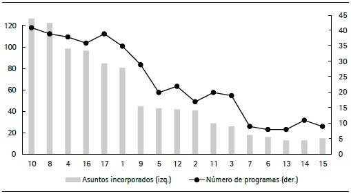 La Figura 3 presenta la sumatoria de los asuntos relevantes de los ODS que se incorporaron en los programas (eje izquierdo, barras azules) y el número de programas que incluyen al menos un asunto relevante de cada ODS (eje derecho, línea naranja). Así, por ejemplo, el ODS 8 cuenta con 123 puntos (o asuntos relevantes incorporados) y 39 programas incluyen al menos uno de sus asuntos.