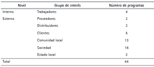 Por tipo de beneficiarios, cuatro programas se dirigieron, principalmente, a un grupo de interés interno a la organización que lo implementó (en este caso, trabajadores) y 40 programas se orientaron a grupos de externos, entre los cuales se destacan comunidad local, con 13 programas, y sociedad9, con 16 (véase Cuadro 1). El común denominador de estos actores —ya sean internos o externos— es que incluyen a poblaciones en condiciones de pobreza y vulnerabilidad (trabajadores, clientes, comunidad local y sociedad) o a actores que operan con recursos escasos y poca capacidad técnica (proveedores, distribuidores y Estado local).